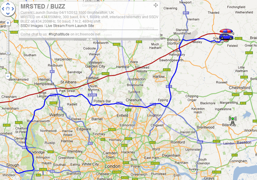 We quickly packed up and took the cylinder and other stuff home. Ali had to leave so Julie and I jumped back into the chase car to head for the expected landing site near Braintree in Essex. As we headed for the M4 Julie checked online and found that we had no live images coming in. Apparently nobody could receive the signal, so we tried in the car and couldn’t receive it there either! This was a surprise as well as a disappointment, since we had a nice strong signal on the ground at the launch site. For now we didn’t know what had gone wrong. Fortunately however the Buzz backup payload was transmitting and being received just fine, so we tuned to that.