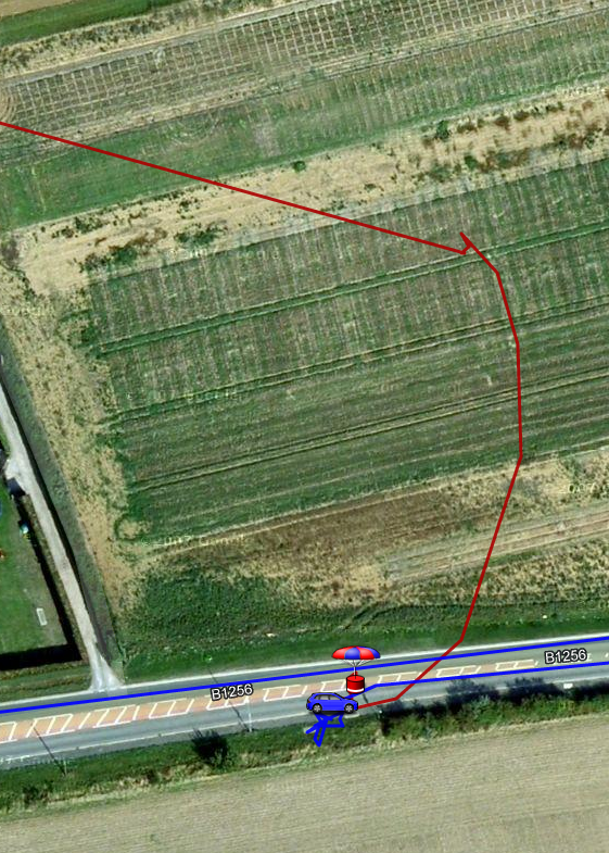As we got closer I kept an eye on the touchscreen panel mounted on the dash of my 4×4. This gave me a distance and direction from car to payload. As we got very close we could see that the payload was on our left and then behind us as we passed the field that it was in. I turned as soon as I could, then parked up on the pavement opposite the landing spot. The screen showed the payload was only 73 metres away, so I grabbed a torch and aimed across the field. Fortunately I’d put some Hi Viz reflective tape on the main payload, and this lit up brightly under the torch light. After quick trek across the field I returned with the payloads and chute in my hands and a sizeable amount of Essex mud on my shoes! Here’s the map zoomed in to show the path of the payloads being carried across the field: