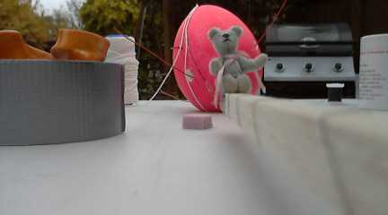The secondary tracker Buzz is in the pink egg at the front of my new launch table. I cut 2 holes into the top to allow for payload aerials to poke through. Here’s a view of Mrs Ted with the pink Buzz payload behind her, and a roll of duct tape (this hobby uses a lot of tape!) next to her: